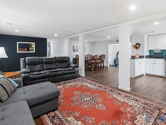 Inside, the open floor plan offers 3 spacious bedrooms, 2 full baths, and a versatile flex room to suit your lifestyle—whether you need a home office, playroom, or hobby space. The sunken sitting room with its wood-burning stove creates a cozy retreat for winter evenings, while freshly painted interiors, new recessed lighting, and brand-new LVP flooring make the home feel crisp and modern.