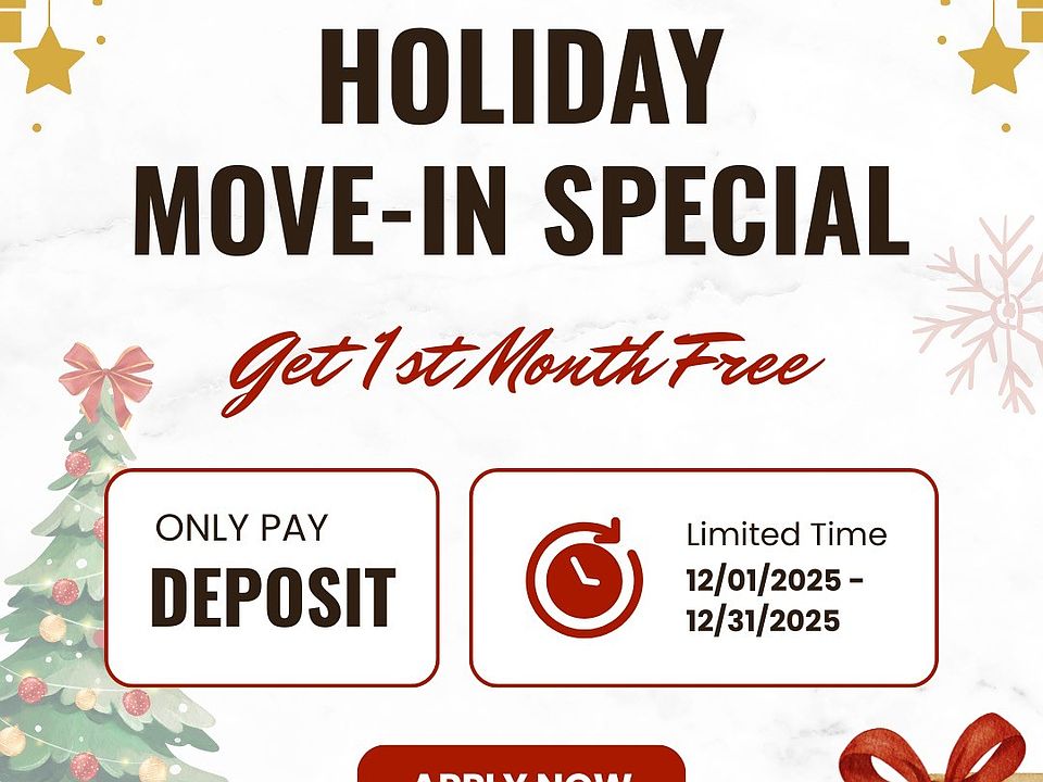 - Special offer! LIMITED-TIME OFFER: GET 1 MONTHS FREE AND MOVE IN EASILY WITH JUST 2 SECURITY DEPOSITS!