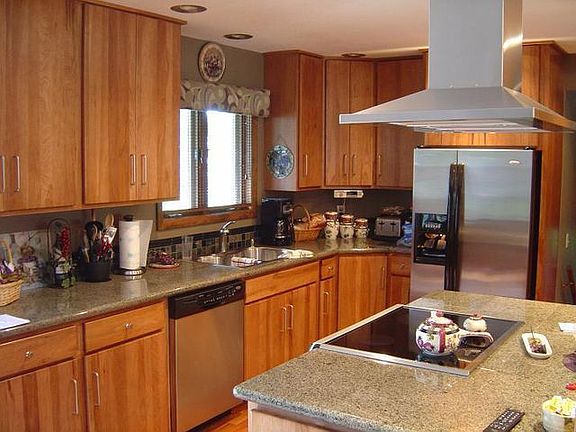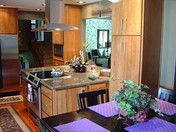 Kitchen new granite, solid hickory cupboards, walnut floor, all appliances stay. Lots of updates - newer Andersen windows, workshop area, Living room plus Family room. 3rd level bar area. Mechanicals all updated. Must see to appreciate! Roof 2012. So much potential here!! Garage doors 2007, Deck wired for a hot tub - absolutely beautiful!