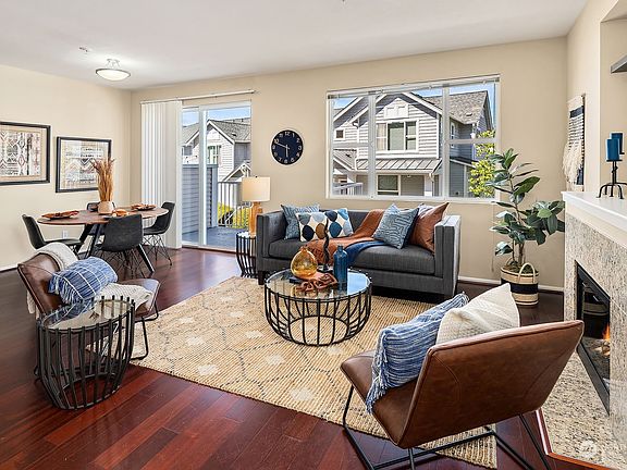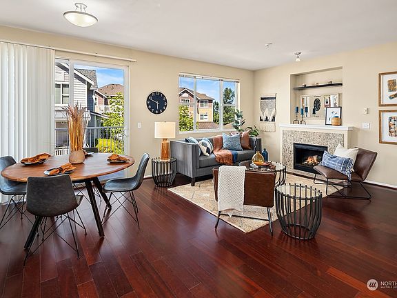 Welcome home to this turnkey, end-unit townhome in Redwood High Point, a pet friendly, award-winning community with tree-lined streets, neighborhood park/playground, walking trails & a convenient location with easy access to waterfront parks & downtown Seattle. Desirable, open-concept main floor features Cherry flooring, kitchen with stainless steel appliances, living space with electric fireplace & dining area with access to a private deck. Generous primary suite with walk-in closet & a ¾ bathroom. Seasonal peek-a-boo mountain views. Huge (425±SF) 2-car tandem garage with storage shelves + additional parking space in front of the garage. In-unit laundry. Newer paint, carpet & water heater. Rental cap not met - owner must occupy for 1 yr.