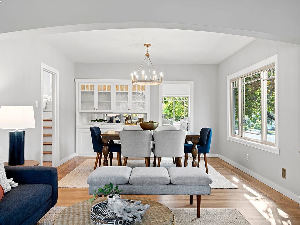 This enchanting East End bungalow was built in 1923 and combines original Craftsman charm with many 21st century updates. Located on a large corner lot, this sun-filled vintage home features 2 bedrooms, 2 bathrooms, traditional living and dining rooms, an eat-in kitchen, a 382- SF versatile basement bonus space, and a detached 2-car garage. Original architectural details include bay windows, newly refinished oak floors, a built-in dining room china cabinet/sideboard + a gas-burning stone fireplace. Attractively updated bathrooms, a newly remodeled kitchen, new stylish light fixtures throughout, and fresh interior/exterior paint. Wonderful outdoor spaces surround the home with patios, mature landscaping, whimsical picket fencing, a fabulous potting shed - even a Finnish sauna! This sought-after East End location is just blocks to Encinal Market and Otis Elementary School, less than 1 mile to Lincoln Middle School + Lincoln Park/pool, Trader Joe's and the many amenities of South Shore Center. Easy access to downtown Park St and convenient to I-880, BART and the SF Ferry and the shoreline. An exceptional, move-in-ready home in a sought-after Alameda location!