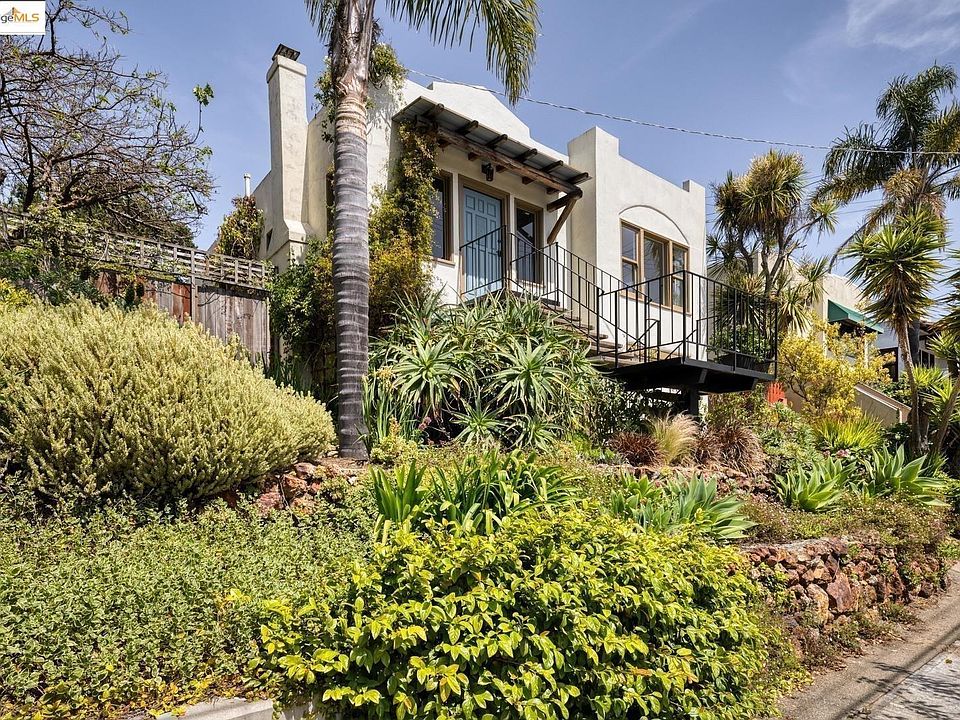 Atop Monticello Avenue, a Maxwell Park Mediterranean bungalow delights. High up with sweeping neighborhood views & privacy, it blends an irresistible combination of modern comfort with classic cool. The kitchen, beautifully updated with Vetrazzo countertops, tile, solid wood cabs & a breakfast nook. Step onto a redwood deck perfect for al fresco dining. Elegant brass fixtures, Moroccan tile, wall-mount vintage French faucet & pocket door enhance a fully remodeled bath. Coved ceilings, stone fireplace & original hardwood floors add warmth - a nod to the home’s 1924 heritage. Abundant natural light fills the open & comfortable living spaces. Every window offers a view. The vibe is casual, comfortable & artistic. The secluded garden is a highlight. Stone pathways lead to several seating/entertaining areas & tucked behind the guava tree, discover a charming garden studio! Saltillo tile, bathroom, Corian counter/sink w/ bed 'nook' -ADU potential. Soak & stargaze from the outdoor clawfoot tub or try the hammock under a shady mulberry. An urban 'orchard' with 17 fruit trees (Meyer lemon, mission fig and sweet apricots +) Thoughtfully planned mature landscaping is colorful, yet water conserving. (Disclosure- Garden is so good that you may be tempted to quit working and just hang out!