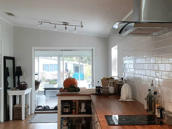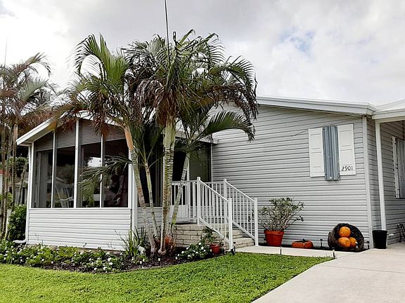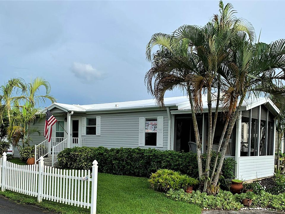 A 2003 Jacobsen model, 3 bedroom/2 baths, 1152 square foot, six room mobile home. Gorgeous designer galley kitchen is newly renovated. Offers lots of cabinets with easy pull drawers. Plenty of working area with the new long countertop. Beautiful glass tile backsplash and a counter breakfast bar. New stainless appliances includes the farmhouse sink and large refrigerator with bottom freezer. There's a new Induction Cooktop and built-in microwave and oven. Lighting fixture upgrades. Large pantry closet and a handy kitchen storage area houses the new washer and dryer. Large open concept plan with living and formal dining rooms. Master bedroom ensuite accommodates king bed suite and a walk-in closet. The large spa bathroom features a garden tub, and separate shower/commode area. Both extra bedrooms can accommodate a queen bed or have plenty of room for your home office. Main bathroom has a full tub/shower and features a pedestal sink. Gorgeous easy care laminate wood floors throughout. Large Lanai porch with ceramic tile flooring and automatic rollup privacy shades to protect you from rain and wind. It's immaculate, spacious and very well maintained. Ceiling Fans, Window treatments, Hurricane Shutter. There is a new 2020 AC unit, new 2020 AMS Roof Over with Lifetime transferable warranty and new 2020 On Demand Hot Water Heater. Nicely landscaped yard with palms and an avocado tree. The carport has a three car parking space and an attached storage shed. Located in a secure gated, age (55+) qualifying, mobile home park. Offering many amenities; two club houses, two heated pools, library, crafts, billiards, bocce, petanque, social events and a community bus. Close to hospital, shopping, restaurants and casinos. A land lease community. Monthly fees of $928.