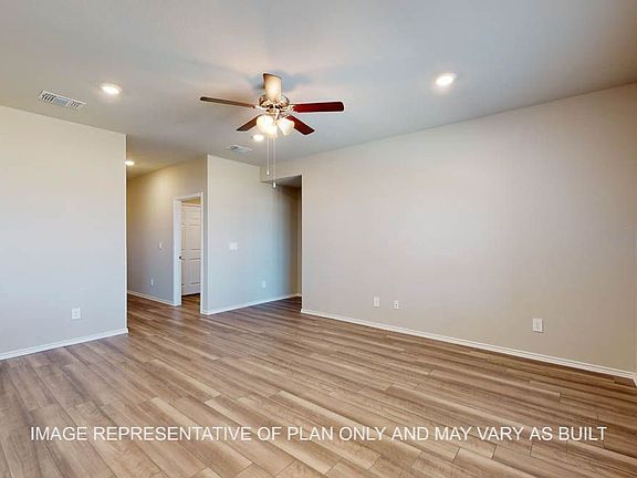 The Fargo is a single-story, 4-bedroom, 2-bathroom home featuring approximately 1,665 square feet of living space. The long foyer leads to the open concept kitchen and breakfast area. The kitchen includes a breakfast bar and corner pantry and opens to the spacious family room. The main bedroom, bedroom 1, features a sloped ceiling and attractive bathroom with dual vanities and spacious walk-in closet. The standard covered patio is located off the breakfast area. Additional finishes include granite countertops and stainless-steel appliances. You’ll enjoy added security in your new D.R. Horton home with our Home is Connected features. Using one central hub that talks to all the devices in your home, you can control the lights, thermostat and locks, all from your cellular device. With D.R. Horton's simple buying process and ten-year limited warranty, there's no reason to wait!
