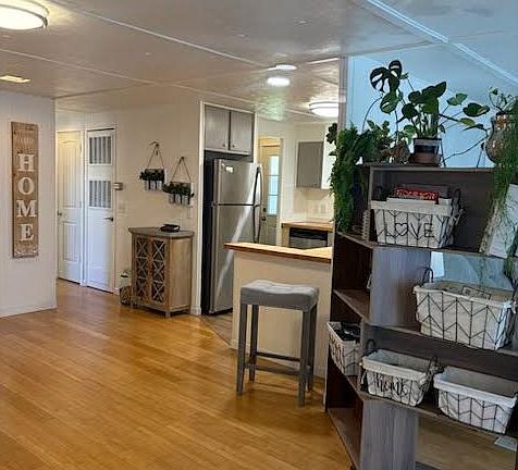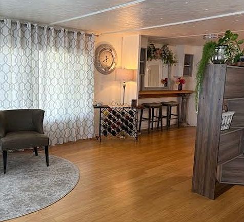 This beautifully remodeled 2-bedroom, 2-bath home (approx. 1,200 sq. ft.) is a true showcase of thoughtful design and quality craftsmanship. Virtually every detail has been updated from the outside in, including new insulation in all exterior walls, tape and texture in all exterior walls, paint, updated electrical, new windows, doors, lighting, fixtures and complete decking around the entire home. The result is a comfortable, efficient, and modern residence in a quiet, private-feeling location.Inside, the open floor plan is filled with natural light and features bamboo flooring and new vinyl in kitchen/baths. The kitchen has been laid out perfectly for both function and style, with a gas range, double stainless farm sink, butcher block counters, stainless steel appliances, washer/dryer—all like new that will all stay with the property upon sale. The private primary suite offers a beautifully tiled shower, upscale quartz counter, and French doors that open to a covered deck. A built-in outdoor fireplace framed by a stained wooden wall creates a stunning backdrop and added privacy, with power in place for outdoor entertainment.The second bedroom includes an exterior exit, making it an excellent option for a home office or creative space. A custom ADA-compliant step-in tub and shower provide added comfort and accessibility in the second bath finished with sleek quartz counter that adds that touch of class, beautiful and functional.Outdoors, the fully fenced property has been designed with creativity and care. Corrugated steel fencing with cedar framing provides both security and style, with separate areas for gardening and pets. A doggie door and dedicated run add convenience, while a private covered soaking tub area offers the perfect retreat after a long day. Can't forget the pool and party room, move in, just settle back and enjoy, as all the work has been done. This is a true unicorn, all it's missing is the bow. Nut Tree Mobile Estates 55+. Still showing