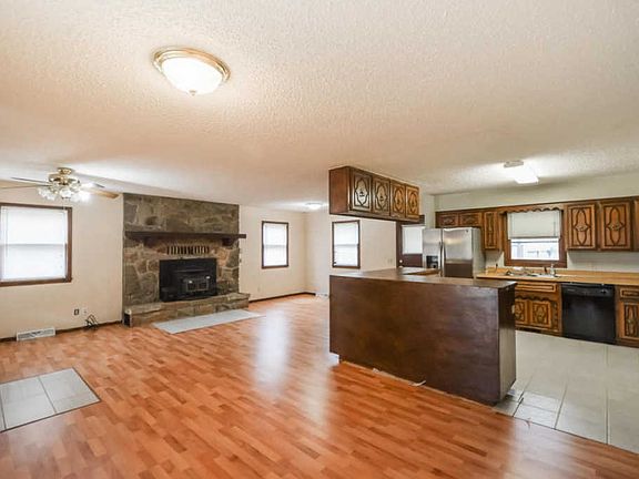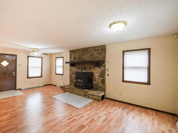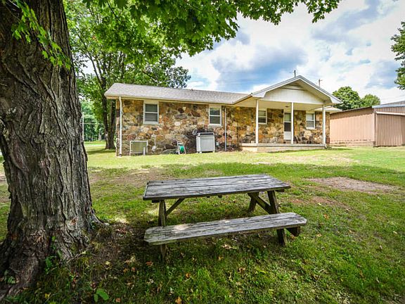 Ready to be rezoned to Commercial! Located on an acre m/l within the highly sought after Ozark school district, this 2 bed 1 bath home has been upgraded with new in-wall insulation, new Sheetrock, new paint, new flooring. There is plenty of room for any of your hobbies inside the three spacious garages that have eight total car stalls, 40x40 shop w/3 overhead doors,one of garages converted into spray booth. AND two additional storage sheds, storm shelter, nice greenhouse, chicken house, dog kennel, and more. Inside there is a lovely wood burning rock fireplace and tons of storage in both the kitchen and laundry room. The exterior of this home is virtually maintenance free native sandstone and has two fully covered porches. Don't wait! Come see this quaint Ozark treasure today!
