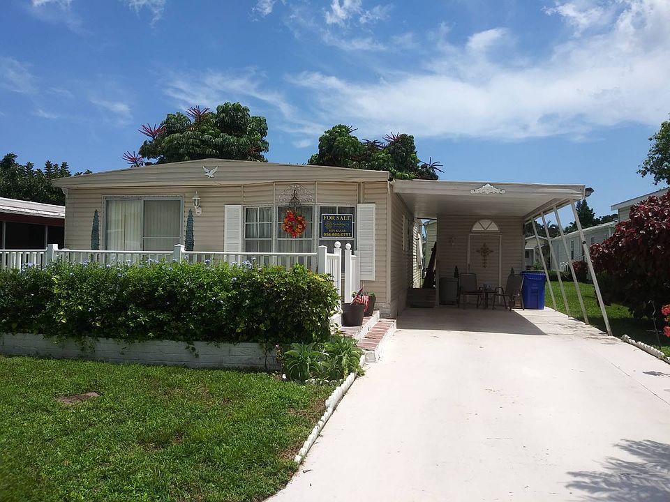 Handyman Special! Two bedroom, 2 bath mobile home in the adult community of Coral Cay. Has pullman galley kitchen with white cabinets and stainless appliances. The back entrance foyer room has a pantry closet. This area is large enough to use as a breakfast room or an office. Large L-shaped living/dining room. Living room has a wall mounted electric fireplace and sliding doors to front deck area. Dining room features glass door built-in cabinets. Large master bedroom with vanity sink and walk in shower bathroom. Main bath has vanity and full shower/tub. Second bedroom features another electric fireplace. Laminate in kitchen and carpeting in remainder of rooms. Carport is extended width and attached shed houses the washer/dryer laundry. Located in Coral Cay, an adult (55+ year) qualifying park. Amenities include a gated community with night security guard, club houses, two heated pools, library, billiard room, bocce and petanque clubs, and socials and a community bus. Close to hospital, shopping, restaurants and casinos.