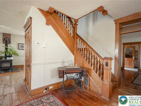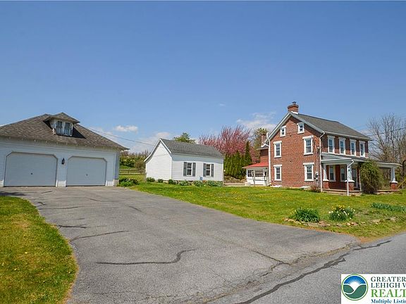 Parkland School District! Welcome to this picturesque 3-bedroom, 2-bath farmhouse nestled on a scenic corner lot, just steps from the newly renovated Neffs Park and within the Parkland SD. This lovely home blends classic character with modern charm. Native Pennsylvania cottage gardens and perennials surround the property, with Concord grape vines and a variety of established plantings including native bushes, blueberry bushes, pear trees, and a dozen organic raised garden beds with a dedicated herb garden. Enjoy relaxing mornings on the expansive covered wrap around porch or the back patio surrounded by natural landscaping. A detached 2-car garage and an additional workshop provide plenty of space for hobbies and storage. Inside, warm chestnut woodwork and hardwood floors span the main level, which features a spacious living room with a soapstone wood-burning stove, a cozy sitting area, and a formal dining room with generous built-in storage. The galley-style kitchen boasts a slate sink and backsplash, and a sunroom off the kitchen adds light and charm to the layout. Upstairs offers a versatile open hallway—perfect for a home office—along with a primary bedroom suite featuring a full bath and walk-in closet, two additional bedrooms, and a second full bathroom. A walk-up attic provides bonus space and just needs heat to become a fully functional space. This home offers timeless farmhouse appeal with space to grow, garden, and enjoy country living in a convenient location.