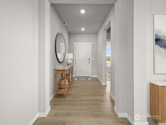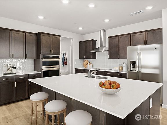 The Davis rambler with 9 foot ceilings has wide hallways and spacious great room, modern electric fireplace w/ mantel and large open gourmet kitchen, walk-in pantry, drop zone for coats and weather gear by garage and utility room. Bedrooms 3 & 4 have a Jack n Jill full bath. Separate dining room for all your entertaining! Two covered porches with large patio's, 3 car garages. Primary bedroom has huge walk in closet and large private spa like bathtub. Front landscape with sprinkler system, irrigation. This home/lot is backed up to the beautiful natural protected wetlands. Final Opportunities! Buyers must register your Brokers at first visit, including open houses. Refrigerator/washer/dryer included. Last remaining home in popular Palomino!