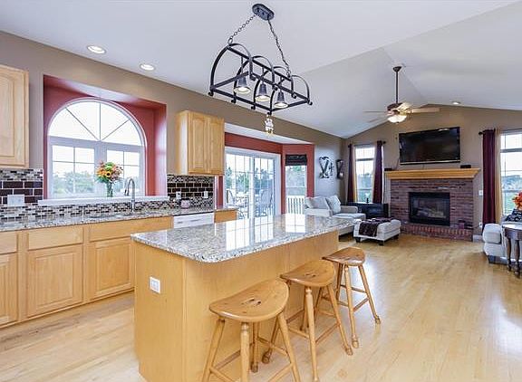 - Kitchen: Breakfast Bar, Center Island, Custom Cabinetry, SolidSurfaceCounter, Pantry, Breakfast Room, Hearth Room