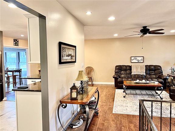 The enviable fully equipped custom kitchen is a chef’s dream showcasing abundant white cabinetry, granite counters, mosaic wall tile, stainless appliances, recessed lighting and eat at breakfast bar. Centrally located formal dining is underscored in wood-grain laminate flooring and is straddled by the spacious living room and sunroom encircled in white-wash shiplap, featuring a vaulted pine ceiling, woodgrain flooring and a stone accent wall. An undeniably attractive bathroom is complimented by an oversized vanity, country-inspired backsplash, wood grain ceramic flooring and custom shower. Finished lower level hosts a laundry room and luxurious 2nd bathroom accompanied by a jetted tub. Newer roof, soffit, fascia, gutters, siding, Montana river rock stone front, rear windows, 2 car garage with dog wash station, rear deck, shed and paved driveway!