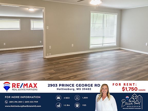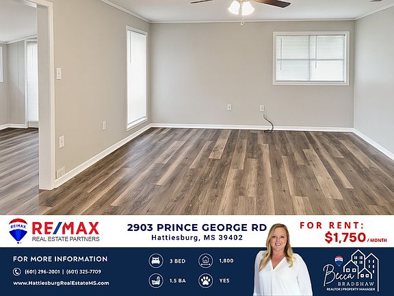 $1,750/month 3 Bedroom, 1.5 Bathroom Pet Friendly Located in the heart of Midtown Hattiesburg, 2903 Prince George Rd offers a comfortable blend of convenience and charm. This home features a bright and open living space, a kitchen that flows into a dining area, and recent updates throughout. Outside, you will find a covered front porch, a fenced backyard with a private patio, and a 2-car attached carport with an additional outdoor storage room. Pets are welcome with approval, a $250 non-refundable fee per pet, and $25/month pet rent per pet (limit 2, no aggressive breeds). Tenants handle lawn care, pest control, and utilities. Close to USM, Forrest General Hospital, Hattiesburg Clinic, Highway 49, and I-59, this location is ideal for medical professionals, students, and commuters alike. Available August 15, 2025. Security Deposit: $1750 | Non-Refundable Pet Fee: $250/Each | Monthly Pet Rent: $25/Each | Pet Limit: 2 Total | No Aggressive Breeds Application, credit check, criminal check, pay stubs, and photo identification required. Each adult over the age of 18, must complete an application and pay a $40 processing fee.