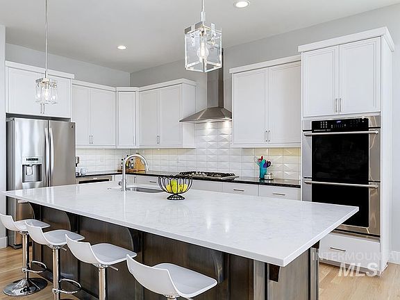 Luxury living at new heights in Harris North! Cradled by miles of foothills, this NE Boise setting backs to nature’s playground with direct access to the Ridge to Rivers trail system while sitting less than 10 minutes from downtown! The refined modern-prairie architecture lays the framework for an interior designed for elegance & entertaining. Beautiful white oak hardwood floors and 10’ ceilings make up the great room, as designer light fixtures add visual interest and banks of windows frame the stunning view corridor beyond. The generous kitchen island beckons gathering, topped with rich granite countertops with plenty of room for prep work and conversation. Premier Electrolux® stainless steel appliances ensure top-tier performance while beautiful white cabinetry and subway backsplash showcase a magazine-worthy backdrop. Telescopic doors open the home to the outdoor living room, allowing guests to float in and out seamlessly.