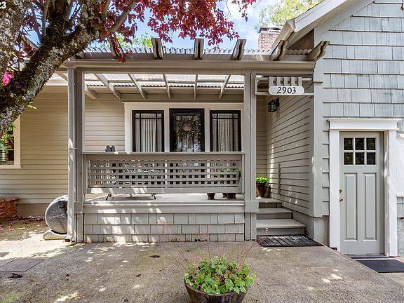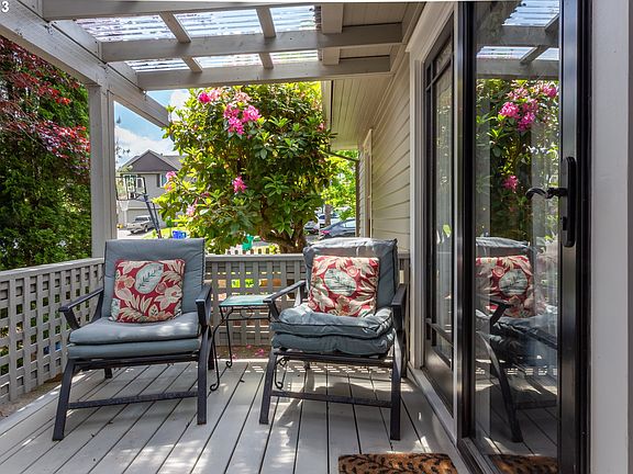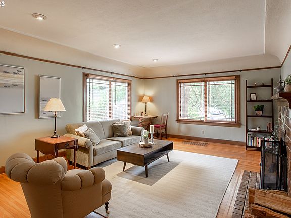 This inviting home is a one-of-a-kind vintage treasure in a friendly neighborhood of newer homes. Built in 1923 with period details intact - Wood clad windows, French doors, hardwood floors, coved ceilings, Claycraft artisan tile fireplace, built-ins, original Doug fir doors, trim, and original hardware. The living room and dining rooms are spacious, ready to entertain guests or relax by the fireplace. A back covered patio and deck offer private tranquility, the front covered porch is screened from the street by mature landscaping, extending your living areas to the outside. A skylit loft serves as the primary suite with built-ins, sitting area and a bathroom remodeled to period with pedestal sinks, gorgeous free standing soak tub and retro fixtures, walk in tiled shower. Tons of storage in the kitchen and a cute nook for eating or an office area. Even more storage in the unfinished basement. Have peace of mind knowing this home has been maintained with care - siding recently repaired and exterior painted in 2022, new Trex deck in back and new cover structure over the front porch. If you love the charm and quality of vintage homes, this one's for you!