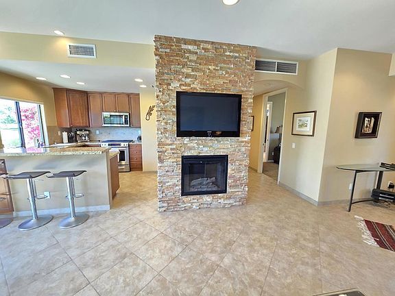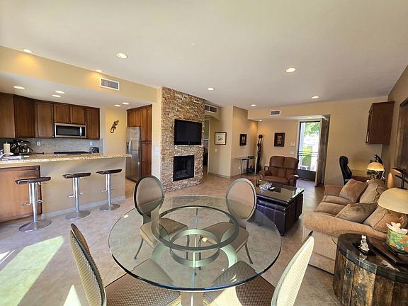 Amazing views of Mt. San Jacinto and (2) golf holes: Cielo #6 and #7. Beautiful evening sunsets. Fully remodeled in 2007 with additions of fireplace, kitchen remodel, new corner windows, extra storage and built ins. Tastefully decorated and everything stays! Move right in. This condo is the one you waited for, don't miss it! Land Lease extended to 2069. Monthly ground rent is $185.00.HOA DUES INCLUDE: 2 DVR or HD Cable boxes and service, High Speed Internet, grounds maintained to your door by HOA ground maintenance crew, outside pest control when requested, outside water, (you pay only for inside water). Gated community with 24 hour guard gate access, membership to Health and Fitness Center, Tennis, Bocce Ball, Pickleball. The Desert Princess has an affordable 27-hole PGA Championship golf course, no Tee-time lotteries, no initiation fees, rated among the best in the valley by GOLF DIGEST. This quiet community is away from the noise yet minutes from everything that is in Palm Springs; restaurants, shopping, casinos, an international airport, the Tramway, Art Museum, Theaters, and the Street Fair.
