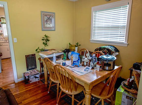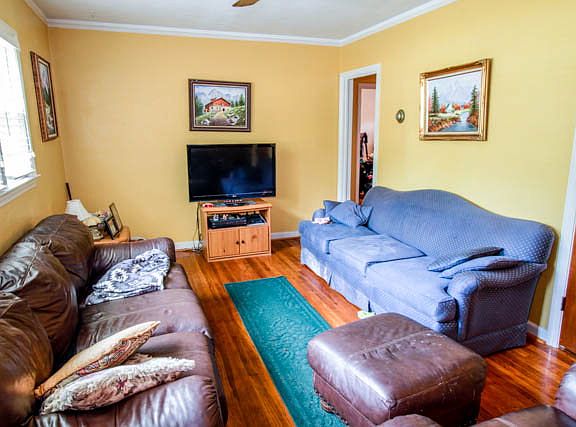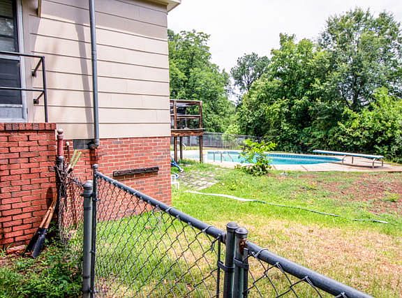 Brick/siding home with 2 bedrooms and 1 bath. Hardwood floors throughout with a living/dining area. Located off of the dining area is a kitchen. Den contains pine paneling along all walls. Nice deck overlooks large pool with diving board. Back yard is fenced in with some grassy yard area.