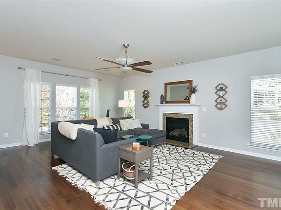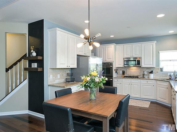 LOCATION! Home features HARDWOODS on 1st floor. Bright, open kitchen w/ gas cooktop, GRANITE counter tops, double oven, tile backsplash. Whole house audio, surround sound in family room. Upgraded trim/moldings, LARGE master suite w/ walk-in closet, separate garden tub, tile flooring in baths, private backyard,. Refrigerator, washer & dryer conveys! Close to greenway, community pool and playground. CLOSE TO RTP, Shopping, I-540 & I-40.
