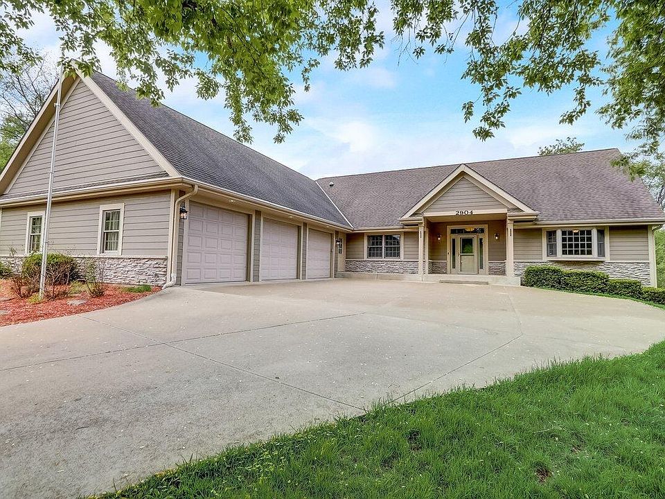A rare opportunity awaits you on this 4 BR Waukesha Ranch nestled on a 2-ACRE cul-de-sac lot. Dramatic vaulted ceilings welcome you into the large open Living area. Desirable split bedroom layout plus 4th BR that also operates as the essential Home Office. Eat-in Kitchen w/ soaring ceiling & sliding doors to the 2-tiered Deck. Enormous Dining RM flexible to host the largest of gatherings. Relax & enjoy the panoramic 4-Season Room w/ gas stove. King-sized Master suite w/ walk-in closet. Spectacular 39' x 29' pro-style insulated Garage w/ commercial heat, tall entry height, & floor drain. Whole house backup Generator, cent vac. ENORMOUS exposed lower level for even more expansion PLUS attached BONUS Garage accessible from basement. Ramp entry at GAR & Wheelchair Accessibility throughout.