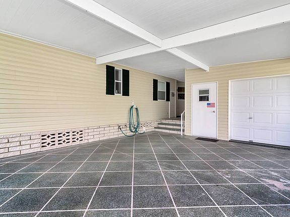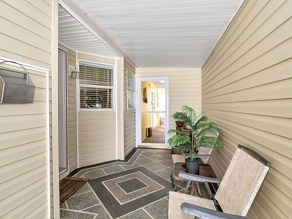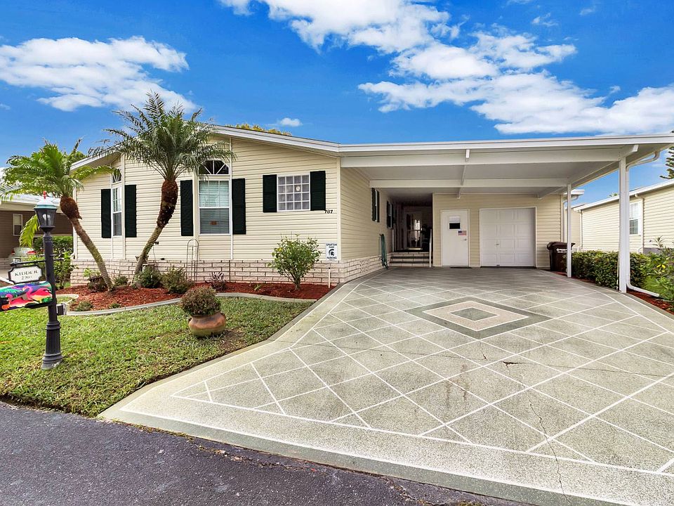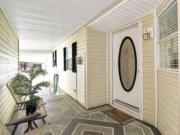 This is an impressive home from the moment you walk up the front stairs to the platform entrance. The two bedrooms plus den creates plenty of room for guests, while the open floor plan ensures that the cook doesn't miss any of the fun while taking care of company. A large Florida room has been added off the dining room for generous living space, and an outside patio provides a great place to BBQ. The kitchen features new countertops & stainless steel appliances! Everything from the gorgeous mahogany flooring to large crown molding adds to the stunning décor which makes you want to stay and enjoy the home. Both bathrooms have updated counters and the master bath features an upgraded mirror! New roof in 2018. If you want a beautiful Florida home in which to enjoy your retirement, it doesn't get any better than this! The purchase of this home includes all appliances, a newer golf cart, plus ONE YEAR FREE GOLF.