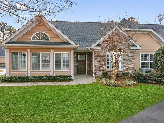 BACK ON MARKET-STEP-LESS RANCH w/ 3Beds/2bath PLUS SUNROOM! Largest Floor plan! Newer hardwoods throughout-no carpet! Plantation Shutters! Fireside living rm w/ vaulted ceilings. Eat-in kitchen w/tile flrs & All apps included-even washer/dryer! Well maintained, restaurants/shops across the street. Easy access to GA 400 or 5-75/ East Cobb or Woodstock! Newer AC, Roof & WH! GATED Community features an Active Adult lifestyle-lots of events! Pool, Wildlife Sanctuary, Clubhouse, ect. Storage Closets to remain in garage! 3rd bedroom doesn't have a built-in closet.