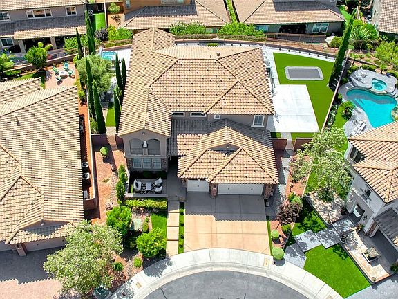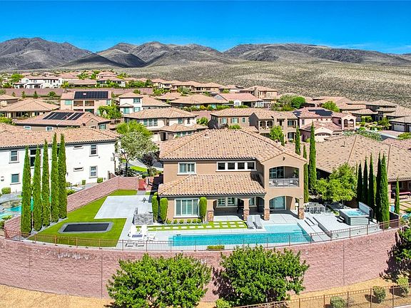 Club Madeira Guard Gated Community! This Expansive Home Sits on 1/4 Acre Cul-De-Sac Lot & Features Stunning Panoramic Strip & Mountain Views w/ Breathtaking Sunsets! Improvements Include Remodeled Bathrooms, New Staircase/Railing, LVP Flooring, Water Filtration, Built-in Entertainment Center, Window Coverings & More! Renovated Kitchen w/ 42" Counter-Depth SS Refrigerator, Quartz Counters, Extended Island & Added Cabinets, 2 Built-in Beverage Refrigerators & New Dishwasher. Theater Room w/ Custom Black Barn Doors & Rolling Shades. Primary Bedroom Downstairs w/ Backyard & Pool Access, Extended Sitting Area, Custom Closet & Stunning En-Suite w/ Remodeled Shower & Free Standing Tub. Upstairs Loft Suitable for Office or Playroom. Oversized Secondary Bedrooms - 2 W/ Private En-Suites! Garage Has EV Charging & Epoxy Flooring. Gorgeous Backyard w/ Built-in Firepit, Heated Lap Pool, Above Ground Spa on Raised Deck, Gated Dog Run, In-Ground Trampoline & Built-in Basketball Hoop. LID is Paid Off!