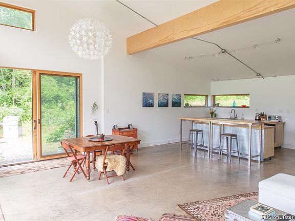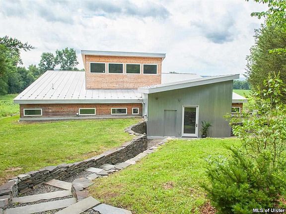 The South facing upstate house is an innovative merging of modern design meets Earthship. Designed to work using a combination of passive solar and thermal mass construction, this home is set on a stunning parcel with mountain and meadow views reaching far and wide. The merging of these designs creates a home that is at once extremely energy efficient and esthetically diverse as well as comfortable for living and entertaining. Commune with nature from the comfort of your own home, and when that's not enough, step out into your own private nature preserve. Gorgeous stone walls and a walkway lead you to a bright, open, airy layout with beautiful clerestory windows, sliders to the deck, all overlooking the magnificent views. Top of the line custom kitchen is open to the living area offering an elegant living space. Three generous sized bedrooms all have access to the deck and views via sliding glass doors.The house is partially built into the ground on the north, east and west sides using Insulated Concrete Forms (ICF) and uses Structurally insulated panels (SIPs) for the remaining exterior structure. SIPs panels overhang the south face of the house. This overhang allows the sun's rays at lower cast in winter to enter through the south face wall of glass, effectively warming the house. In Summer the same overhang protects the house from the sun's rays allowing the cool thermal mass to do it's job uninterrupted. Potential for solar hook up. If you seek understated luxury and comfort combined with low maintenance efficiency, look no further.