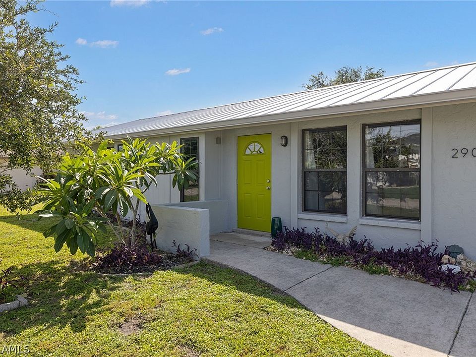 ASSESSMENTS IN & PAID!! X500 flood zone. NEW modern metal roof 2022. NEW A/C 2020. Situated in desirable Southeast Cape Coral, you get all the mid-century vibes in this charming home offering 3 bedrooms, 2 full baths, and a 1-car garage located in a family-friendly neighborhood setting. The updated kitchen boasts beautiful dimensional granite countertops, glass mosaic tile backsplash and a contemporary range hood. The oversized .26 acre lot is well maintained and perfectly situated with rear southern exposure for a seasonal garden. Across the street, the tranquil Rubicon Canal provides serene water views for those delightful evening walks while you enjoy the vibrant & colorful Florida sunsets. Conveniently located close to Coralwood Mall, Downtown Cape Coral and even more shopping, entertainment and dining just minutes away in every direction. All that AND easy access to Fort Myers from both Cape Coral bridges, you won’t want to miss out on this MCM gem in tropical paradise!