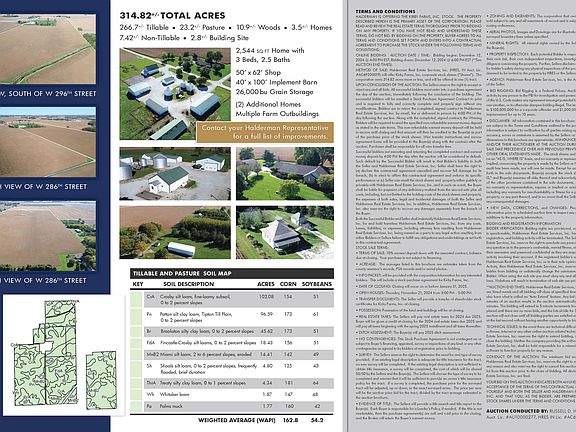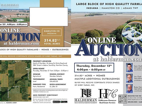Kirby Farms Inc. - Online Only Public Auction 12-12-24. Price reflects STARTING BID PRICE. Note that Buyer Will Receive CORPORATE STOCK SHARES of Kirby Farms, Inc. that owns the real estate, which presents an exceptional buying opportunity. Distinct opportunity to purchase a large block of farmland in northern Hamilton County near the Hamilton-Tipton County line. Property includes 314.82 acres in total with tillable acreage (266.7 acres), pasture (23.2 acres), wooded acreage (10.9 acres), three homes (3.5 acres), and a set of farm buildings (2.8 acres). See included maps, auction brochure, and terms and conditions for auction details. Sold As Is. Farm open for lease in 2025. Visit Halderman website for virtual tour and more auction details.
