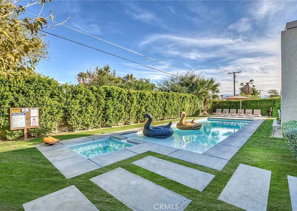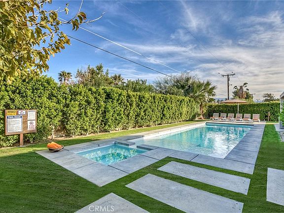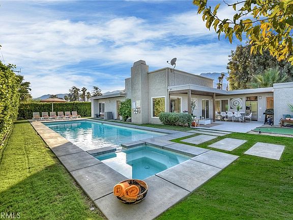 This resort-style oasis offers style, sophistication, and entertainment. Located near Downtown Palm Springs. Minimalist Palm Springs Modern interior with inviting pool and spa, bocce ball and putting green. Situated on a large corner lot, fully lined with tall private Fica trees, real green grass, plenty of space to run around, front yard, side yard, back yard, fenced in pool and mountain views of Jacinto Mountains. A must see with 15 foot ceilings and modern interiors, a truly beautiful property. Open concept living and kitchen area with patio overlooking the spa, pool and gaming areas. Converted Garage, Quartz countertops, tile and carpeted flooring, A/C, fireplace, central heat, 2 refrigerators, wine cooler, BBQ, outdoor full size bathroom off patio , laundry room, 3 car parking. Turnkey. Owned Solar panels for reduced electric bills. A must see!