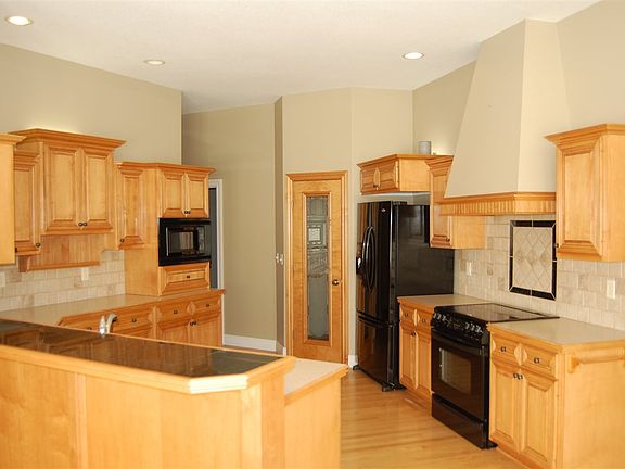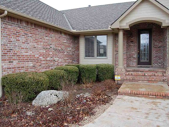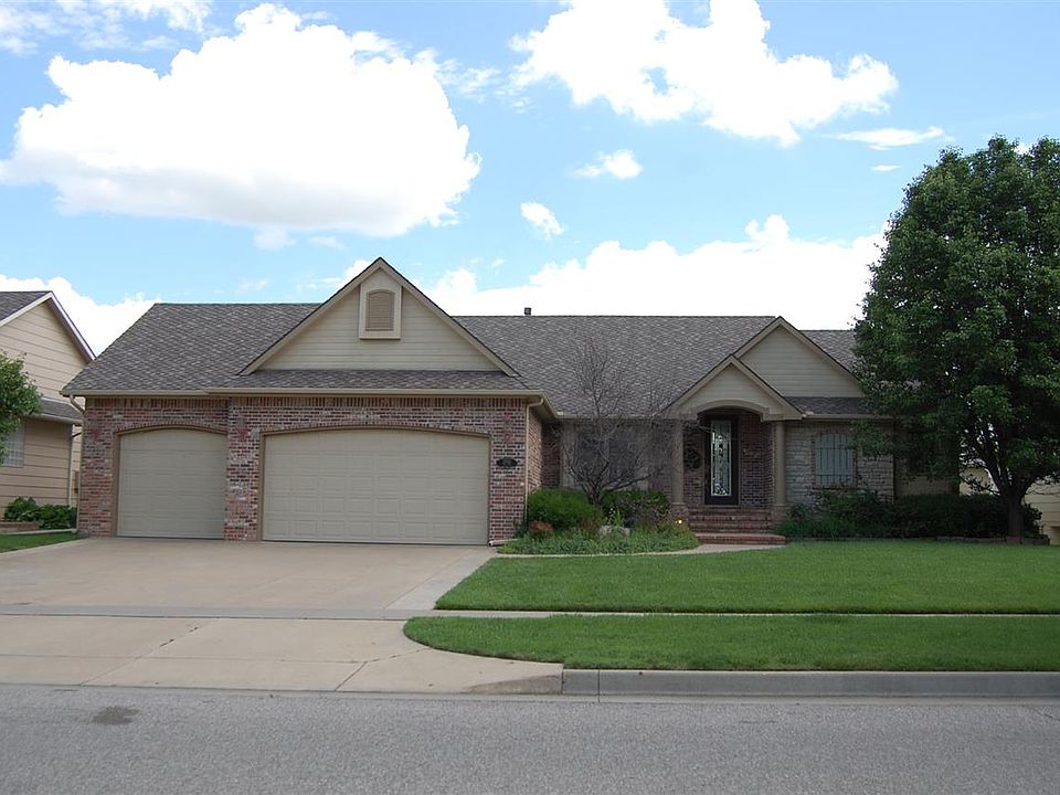 Randy Ketzner former ranch model. Very open place with hardwood floors, formal dining and living rooms, huge kitchen with eating bar, pantry, and main floor laundry. Main floor also has upgraded trim and base boards. Large master bedroom and master bathroom with double sinks and walk-in closet, tub and a separate shower. Full finished walk-out basement with two bedroom, wet bar, office, family, and rec room. The backyard is an east facing backyard. There is an oversized, sheetrocked three car garage and no specials in Maize Schools.