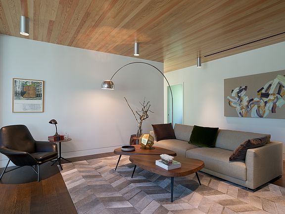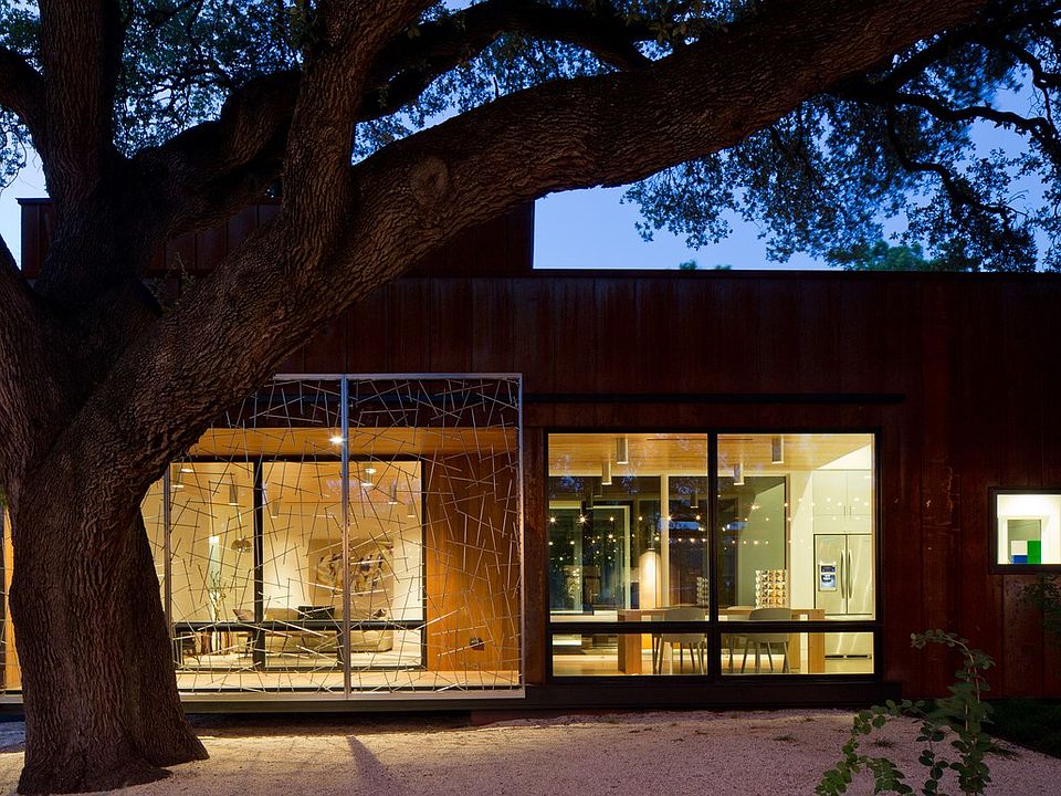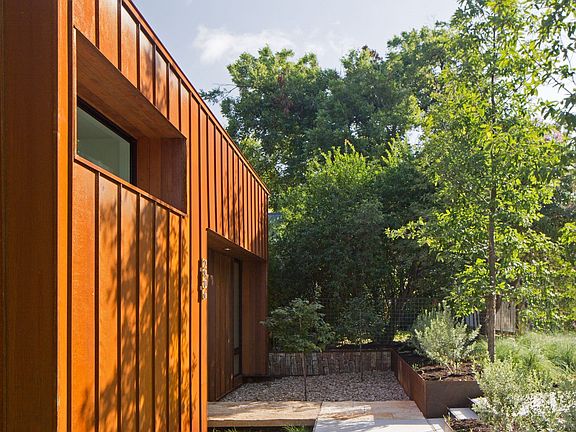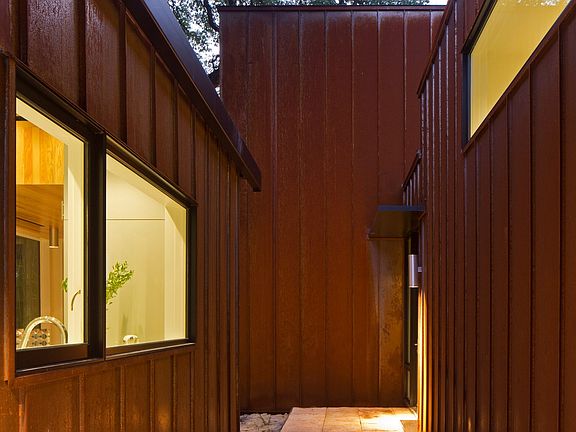 On 2015 AIA Tour-The Treehouse. Architect designed and clad in Corten steel, Ipe and double-paned glass. Minimalist in design, the home features oak floors and Douglas fir ceiling areas, hidden built-ins in living room and kitchen, and drought resistant plantings by Ten Eyck Landscaping. The SS and Quartz chef's kitchen is open to the windowed dining area. Upstairs master has large double sliding doors to terrace adjacent to a +/- 12' circumference Live Oak.