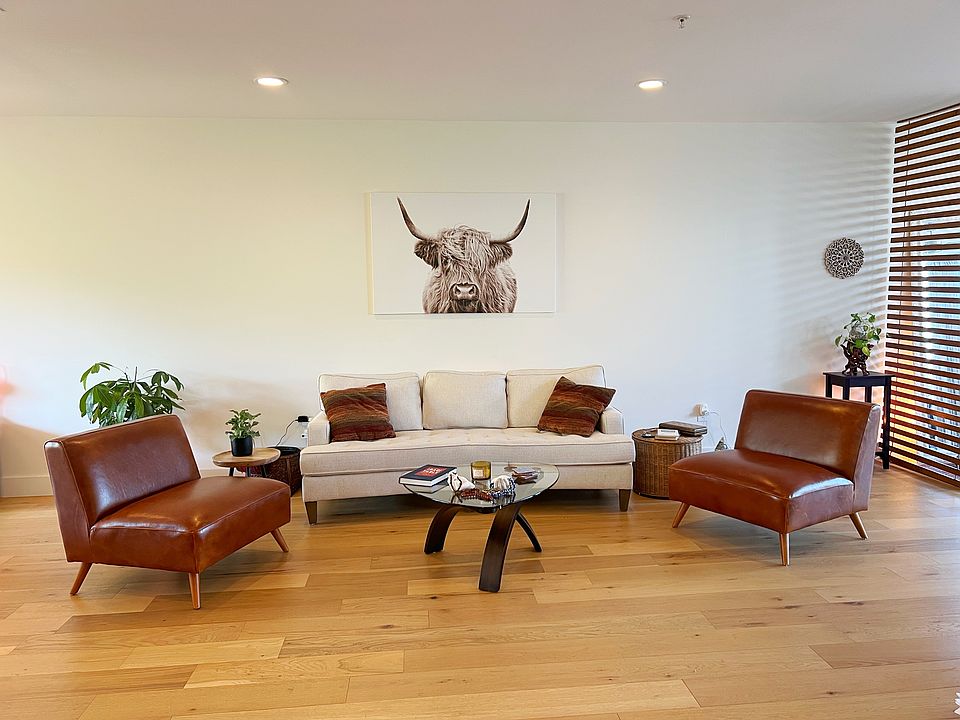Sunlight and spaciousness are the key ingredients in this modern loft. An open floor plan with towering east-facing windows fills the space with morning light, while sliding glass doors open to a west-facing patio that glows at sunset.