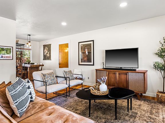 Welcome to this sweet midcentury marvel in Country Club Manor! This gorgeous, light-filled home offers the space you need in a prime Boise location, with convenient access to BSU, Hillcrest Country Club, Micron, and downtown. The expansive living room, along with the formal dining area, boasts beautiful hardwood floors and provides a picturesque view of the enormous backyard, perfect for relaxation and entertaining. The kitchen exudes midcentury flair with its sleek flat panel cabinets, offering both functionality and a touch of vintage charm. Three generously sized bedrooms feature built-in closets and beautiful hardwood flooring. Set on over .20 acres, the property offers a serene garden setting, enhanced by the privacy of a new custom wood fence and the advantage of a corner lot position. This home has style and an unbeatable location in the heart of Boise.