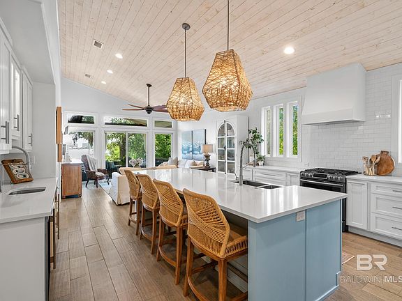Welcome to your waterfront oasis in Orange Beach, AL! Nestled on a sprawling 1.05-acre lot along the picturesque Bayou St. John, this stunning 6-bedroom, 5-bathroom retreat offers the ultimate coastal lifestyle. From its private beach, pier, and boat house to its three serene outdoor seating areas, this property is designed for relaxation and entertainment. Spanning 3,254 square feet, the home has been extensively renovated, blending modern luxury with timeless charm. In 2020, two bedrooms and two bathrooms were added, along with a new Trex staircase and porch, complete with a lift. The main floor now boasts 5 bedrooms, 4 bathrooms, a spacious living room, a chef’s dream kitchen, and a convenient laundry room, all adorned with luxury vinyl plank flooring throughout.The gourmet kitchen is truly the heart of this home, featuring an abundance of custom cabinetry, a stunning quartz island, a chic tile backsplash, and ample seating space. Equipped with top-of-the-line stainless steel appliances, a gas range, wet bar with a wine refrigerator and ice maker, this kitchen is perfect for entertaining. A new metal roof was installed during the renovation, along with an extended, water-facing deck that provides breathtaking views and quick access to the beach and pier via a newly constructed staircase. The lower level offers a private bedroom and bathroom, a game room, second laundry room, and a versatile office space that doubles as storage. Two additional storage rooms provide easy access to water toys and yard equipment. This property features modern upgrades, including two new HVAC systems (2021) and a tankless electric water heater (2021). The pier is a boater's dream, complete with covered decking, a 16,000 lb boat lift with a new motor (2021), power, and water. The pier and boathouse decking were replaced in 2021. Minutes from the islands and Gulf, an opportunity you do not want to miss! Buyer to verify all information during due diligence.