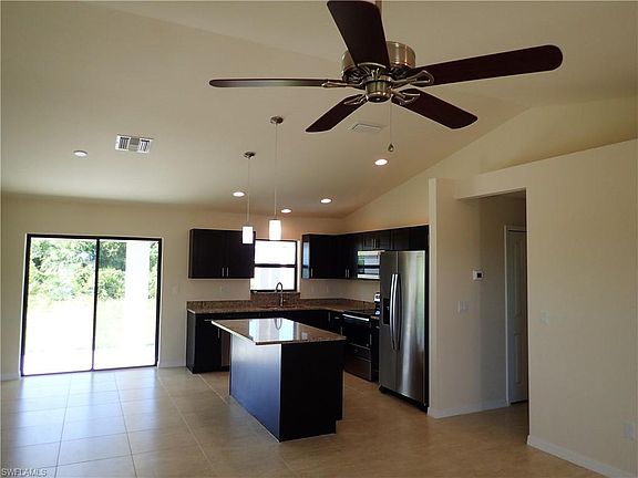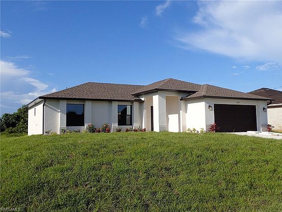 Great central location south of Lee Blvd. and East of Sunshine Blvd. Southern exposure and plenty of room to add a pool plus not located in a flood zone, flood insurance may not be mandatory. This great room design home has 3 bedrooms, 2 baths, 2 ceiling fans, split bedrooms, inside laundry room with deep sink and a large (9x20) open lanai. Other features of this home include: 16 seer a/c unit, low E single hung tinted dual panel insulated glass windows, tile floors throughout with carpet in 3 bedrooms, granite countertops in kitchen & bathrooms, master bedroom has tray ceiling, large walk-in closet with a master bath that has dual sinks & walk-in shower. Landscaping to be completed with Bahia sod and miscellaneous shrubs. Stainless steel kitchen appliances.