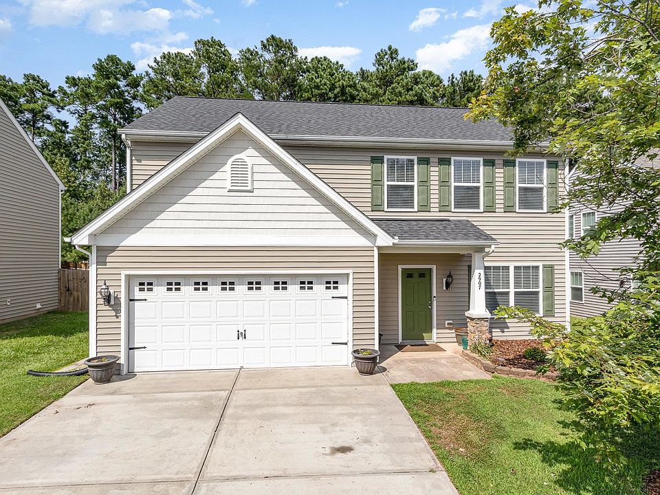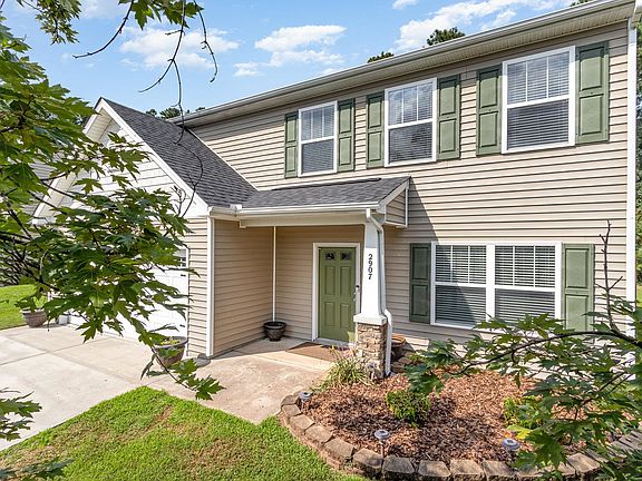 So gorgeous! Fresh interior paint. Updated light fixtures. New bamboo flooring. Formal Dining room and Living Room accented with arched opening. 9ft smooth ceilings. Open, large family-breakfast/dining-kitchen w island. 42' white cabinets in kitchen. Beautiful granite counters and tile backsplash. SS Farmhouse sink. Pantry. Large MBR with garden tub, separate shower, dual vanities & WIC. Plus Loft & spacious secondary bedrooms. NO CARPET! Roof - June 2023. Fenced Back yard. Homesite backs to 50ft buffer green space. Easy access to anywhere in the Triangle. Playset in backyard and shed convey.