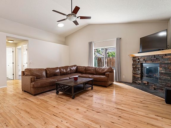 Spacious & well-designed, this ranch-style home lives large with vaulted ceilings, abundant light & open-concept living. The great room features a gas fireplace & flows into a gourmet kitchen with island, stainless appliances, solid-surface counters, tile backsplash & pantry. Private primary suite offers vaulted ceilings, double vanity & walk-in closet. Upgrades include fresh paint, hardwoods, solar tubes, A/C & forced air. Fully fenced, low-maintenance yard has turf, patio, sprinklers & drip system. Located on a quiet cul-de-sac near parks, trails & top-rated schools.