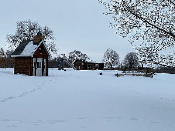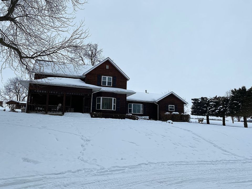 Large 4 bedroom country home on three acres with views for miles. Eat in kitchen open to formal dining room. Dining room has large built in lighted hutch. Living room has cathedral ceilings and brick gas fireplace. Master bedroom on main floor with dual closets, built in dressers and headboard. Master bath boasts a large jacuzzi bathtub. Main floor laundry with full bath attached including shower stall and full tub. Access from garage to laundry and bathroom. Lots of storage and closets. Three bedrooms upstairs with half bath. Attached heated two stall garage with extra storage area. Several small outbuildings with electric and wood burning heat. 42' x 60' pole shed built in 1991 with cement floors and electric service. Detached 2 stall garage built in 1994 with cement floor and electric service. Property has 2 apple trees, 2 pear trees and 1 peach tree along with grapes and several flower beds.