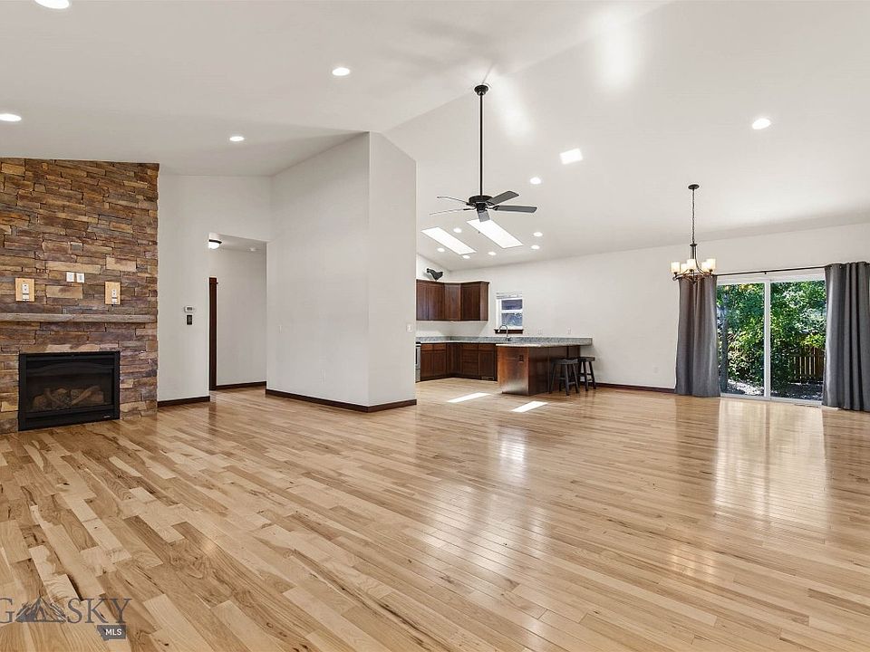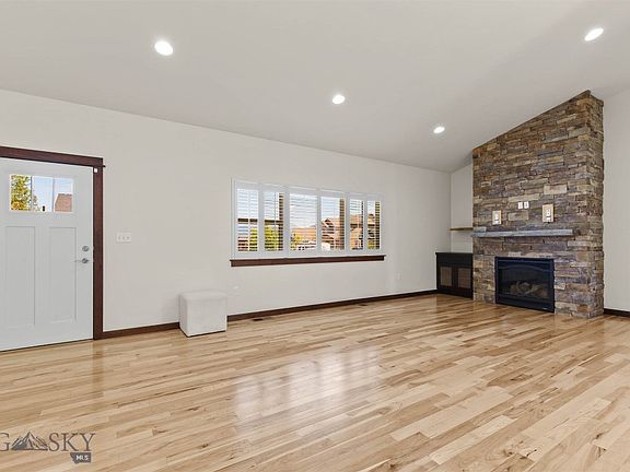 Welcome to this warm and inviting SINGLE-LEVEL, four bedroom home that offers easy living. As you enter, you will view the living room with vaulted ceiling, SOLID WOOD flooring, and a newly added STONE fireplace. There are two bedrooms and one full bath on one side of the home, the primary bedroom suite, laundry, half bath, and one more bedroom on the other. The kitchen has Adler cabinets, stainless steel appliances, granite counters, and two WONDERFUL skylights. Looking to spend time outside? Enjoy the beautiful outdoor patio space, and separate covered deck (approx 14 x 16 ft) that could hold a hot tub. Enjoy shade and privacy with MATURE TREES in the backyard. Beautiful landscaping, a LARGE STORAGE SHED, and a fenced yard with underground sprinklers compliment this large corner lot. You will appreciate the roomy TWO car garage. This home is located just a few blocks from the Gallatin County Regional Park and shopping.