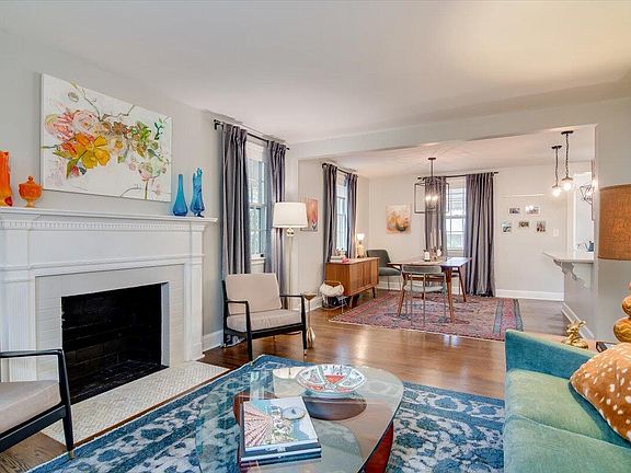 Original hardwood flooring in the living room, dining areas, and downstairs bedroom.