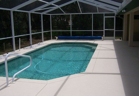Beautiful Golf Course Home With Pool on the 8th Tee, Home features vaulted ceilings, open floor plan, kitchen and breakfast area, Home has been newly painted interior and exterior, the lanai is 12ft x 30ft under hard roof overlooking the pool, pool has a oversized cage that covers the large deck, lanai and garden area. large master suite with 2 large walk-in closets, two vanities, tiled walk-in shower, and access to pool, home has abundance of storage. large laundry room with a deep sink,entrance from pool area to 2nd bathroom and bedrooms. Beautiful landscaping. AC is 2yr old Property is being sold as-is with no known defects. Come take a look.