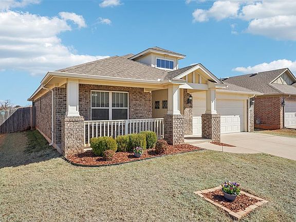 Welcome to this stunning 3-bedroom, 2-bathroom home in Mustang Schools, featuring a thoughtfully designed split floor plan that offers both privacy and functionality. From the moment you step inside, you’ll be captivated by the sleek, modern finishes and abundant natural light streaming through the large windows. The open-concept living area boasts rich wood-look flooring, creating a warm and inviting atmosphere. The gourmet kitchen is a true showstopper, complete with an oversized island, a deep stainless steel sink, and a built-in stainless steel dishwasher—perfect for entertaining. The stainless steel stove and mounted microwave seamlessly blend into the stylish design, while the eye-catching tile flooring features a striking black and white veining pattern, adding a touch of modern elegance. The bathrooms are equally impressive, showcasing beautiful stained wood vanities that bring warmth and character to the space. A dedicated laundry room offers convenience with stained cabinets providing extra storage. Just off the garage entry, a functional mud-bench with deep-stained wood detailing adds both style and practicality, creating the perfect drop zone for bags, shoes, and coats. There is a storm shelter in the garage for added peace of mind! Enjoy outdoor living year-round with expansive covered patios in both the front and back—ideal for sipping coffee in the morning or unwinding in the evening. Nestled in a fantastic neighborhood, this home offers a prime location with easy access to schools, shopping, dining, and major highways. Don’t miss your chance to make this beautiful home yours—schedule a showing today!