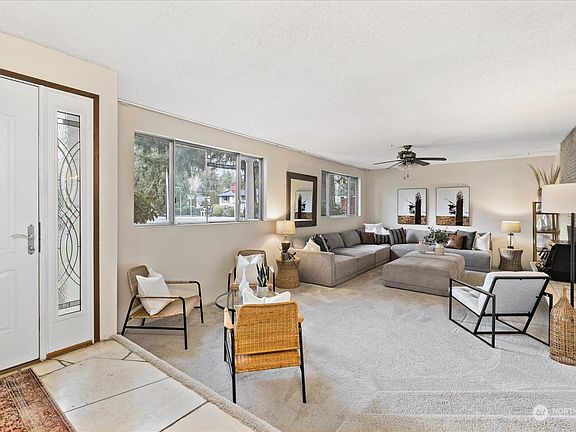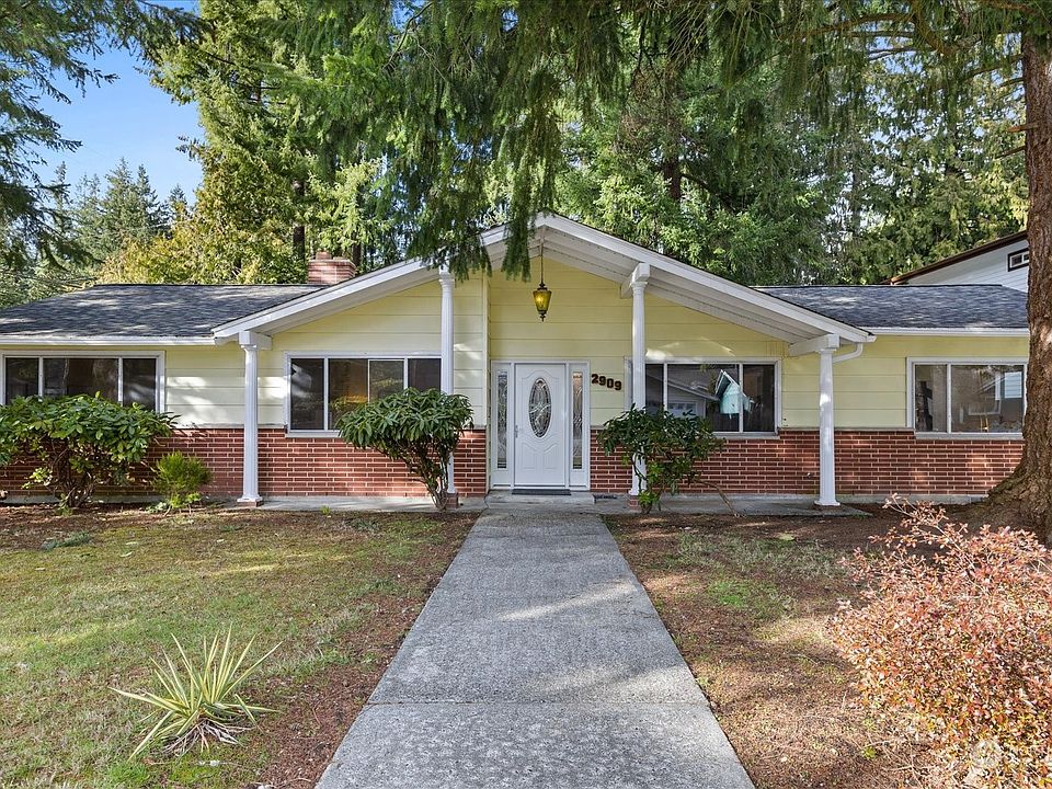One level living & fun outdoor spaces offer an array of options for working, playing and relaxing. A sunken living room with fireplace insert & big windows looks out on trees surrounding the home for a forest feel. Outbuildings provide space – one a simple shed for storage & another for a retreat, studio, or office with power to the building. On a quiet street with similar homes, the new owner can add instant equity with a bit of elbow grease and style. The primary bath has a quirky sunken tub! Come home from shopping to the 2-car detached garage around the side of the property & enter the house under cover right to the kitchen. Shopping is easy access near Everett Mall & Mill Creek Town Center, & Silver Lake is 1.4 miles by car.