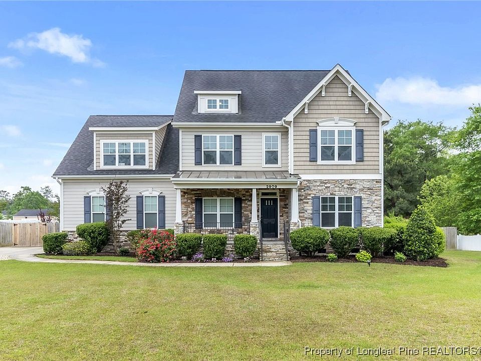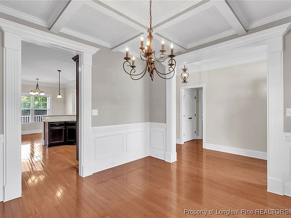 STUNNING EXECUTIVE HOME in Jack Britt School District! With 4-bedrooms, a spacious Bonus Room and 3-baths, it is a must see! The first floor features a Bedroom/In-law suite with hardwood floors, full bath, dining room with coffered ceilings and wainscoting, Great Room with crown moldings, gas fireplace, and 10 ft ceilings throughout. The Kitchen features peninsula bar and granite countertops throughout, stainless-steel appliances including a double oven, garbage disposal, and beautiful custom cabinets. Second floor features the primary suite with vaulted ceilings and large double vanity bathroom with shower, whirlpool tub, and walk-in closet. The remaining bedrooms are also on the second floor with the laundry area. The screened-in back porch overlooks the large, private fenced yard and patio area. Neighborhood amenities include a pergola perfect for events and Lake Upchurch access. Easy access to Fort Bragg with the coming completion of the 295 By-pass.