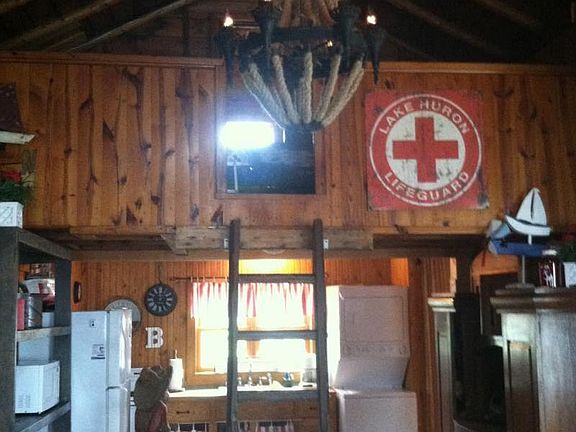 Cottage on Lake Huron waterfront. Wonderful view of the lake. Cabin style home, fireplace heats the whole place plus ceiling fans to move the air. Family room: 22x10.5, Dining Room 8x12, Living room 11.5x15, Kitchen 12.5x11.5, bath 5x6, Bedroom 9x8, bedroom 11x8, bedroom 11x8, loft 11.5x8