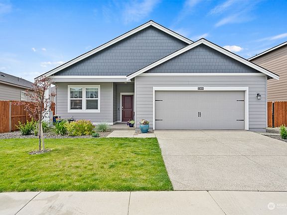 Enjoy single-story living with this 4 bedroom 2 bathroom rambler featuring wide hallways and nine-foot ceilings. Open floor plan with dining room and gourmet kitchen with huge center island. Solid quartz counters, soft-close drawers, stainless steel appliances (all new in 2023 and included in sale), and walk-in pantry. The gathering room has an electric fireplace with mantel and discrete wiring for TV (TV is included too)! Fully fenced yard with upgraded back patio space and no lawn care in back! Recently serviced HVAC in perfect working order (stay cool in the summer and warm during the winter), wired for smart features. Enjoy paved walking trails, a community park, mountain views in every direction, and quick access to town, I90, & HWY97!