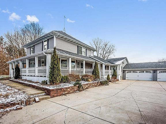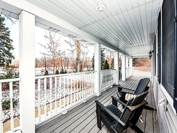 Come home to this historic beauty updated for today's lifestyle! This spacious 4BR/5BA home on 10 acres was built in 1866 and has been lovingly updated with every amenity. The open floor plan includes a light-filled living area with a charming wood stove and leads to the large, eat-in, gourmet kitchen with a center island, stainless appliances and granite counters. A three-season room includes a hot tub, and opens onto the expansive back deck that overlooks green pastures. The finished lower level with walkout has a custom wet bar and fireplace, a home gym, sauna and wine cellar. A beautiful 4-stall barn includes a tack room and arena, and an additional outbuilding provides equipment/toy storage. Plenty of room to add a pool! From the wraparound front porch to the white picket fence pastures, this storybook property is welcoming and warm. Just an hour from Chicago and within 5 minutes of Pine Lake, this is an ideal escape from it all in one of the prettiest spots in LaPorte County!