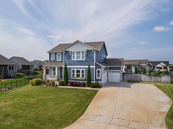 Welcome to this stunning custom home by Nies Construction, located in the popular Sandcrest neighborhood, part of the Maize South School District. The home's attention to detail is evident from the moment you arrive, starting with the charming front porch featuring a cozy swing. Inside, luxury vinyl flooring flows throughout, creating a seamless and low-maintenance living space. The main floor includes a beautiful library, perfect for a home office, with wainscoting and floor-to-ceiling bookshelves and a convenient half bathroom. The open floor plan allows natural light to fill every room. The living room, with built-in cabinets, shelving, and a gas fireplace, connects effortlessly to the kitchen and dining area. The kitchen is equipped with quartz countertops, gorgeous tile backsplash, custom cabinetry, a gas range, and a large island with bar seating. A walk-in pantry provides additional storage. Step outside from the dining area to a screened-in, covered deck overlooking the large backyard. Upstairs, the spacious primary suite offers plenty of natural lighting, a functional yet spa like bathroom with an extended double vanity, quartz countertops, a custom tile shower, a soaker tub, and a spacious walk-in closet. The second floor also features a versatile loft area, two additional bedrooms, a full bathroom, and a convenient laundry room with a folding counter and wash sink. The finished view out basement includes a large family room, bathroom, and additional bedroom. The nearly half-acre lot is beautifully landscaped and includes a sprinkler system, irrigation well, and privacy fence. This home is begging for an in ground pool due to it's large lot size! You’ll also love the spacious side load garage - perfect for a mini workshop still with plenty of room for several vehicles. Sandcrest is a boating community with sandy beaches, pools, a pickle ball court, a playground, and a clubhouse. Residents enjoy access to a stocked fishing lake and a community beach. The home is conveniently located near K-96, New Market Square, and is in the Maize South School District. This home offers luxury living in a fantastic community, Schedule your visit today!