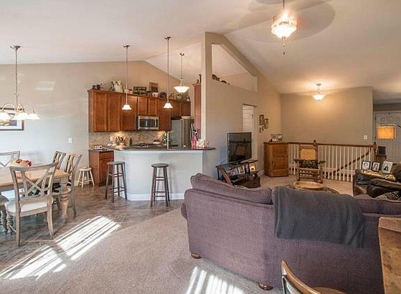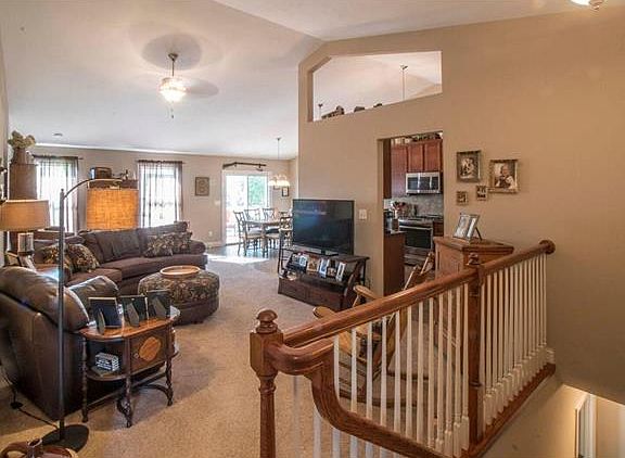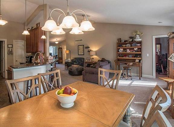 Easy living villa with covered deck backs to trees and common ground. End unit with backyard privacy, level driveway and zero step entry from garage into home. This home features granite countertops throughout kitchens and baths, with upgraded 42" cabinetry. The main floor features a master suite with walk-in closet and double bowl granite vanity. Hardwood foyer and second bedroom / office, main floor laundry, and open staircase. Spacious, open floor plan with vaulted ceilings. The lower level has been finished with entertainment area, small kitchenette, and two additional bedrooms and bath. This lower level space is perfectly designed to allow your company to come stay and have their own separate living quarters. Large covered deck backs to trees and common ground.