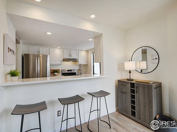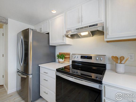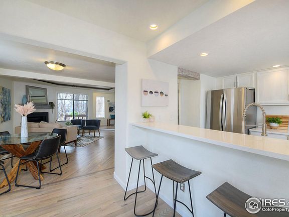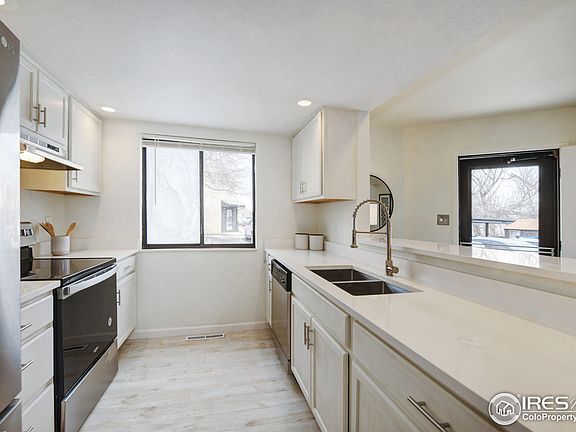 Bright, updated and spacious end-unit townhome backing to woods and a creek and a short walk to Rayback Collective. Peaceful and quiet yet close to everything. Tons of recent updates including new kitchen cabinets and countertops, brand new refrigerator and stove, refinished hardwood floors throughout the main level, new carpet upstairs and in basement, new furnace, new washer/dryer, new paint and many fixtures. Great layout with 2 large bedrooms upstairs with big closets and 2 upstairs baths; primary bedroom has en suite bath with skylight and slider to balcony overlooking the creek. Upstairs laundry. Fully finished basement offers bonus room for guests, TV room, playroom, office etc. Reserved carport parking. Landscaped garden area with bulbs and flowering bushes. Complex has an outdoor pool and hot tub. Walk out the door and onto the bike path; leave your car at home and truly live the easy Boulder lifestyle.